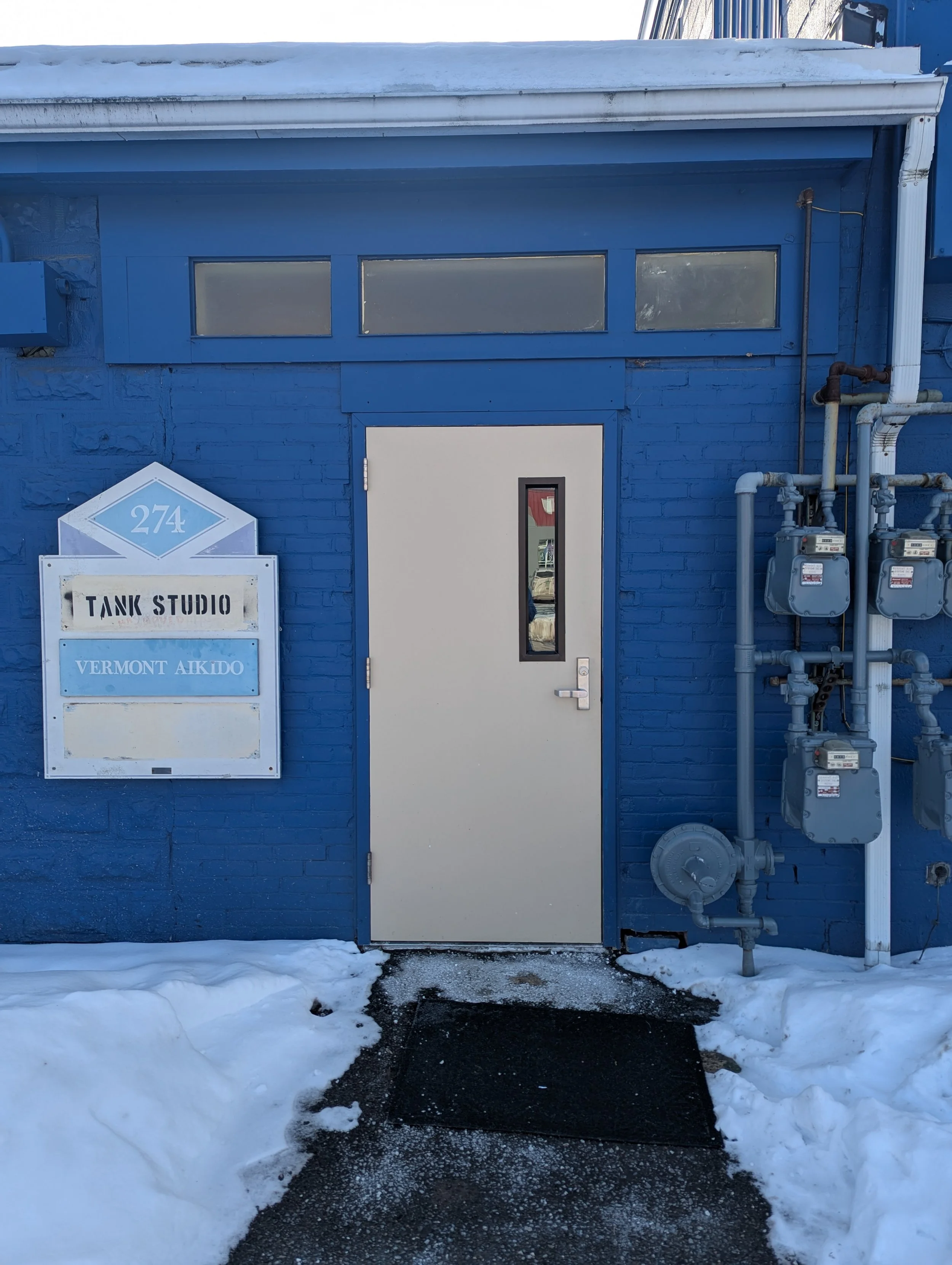 The dojo is on the 2nd floor. The entrance is an unassuming door on the parking lot side of the building.